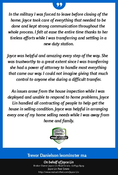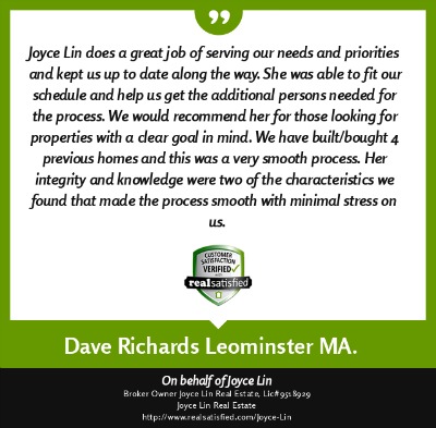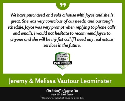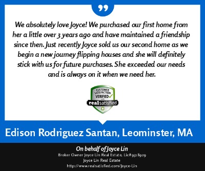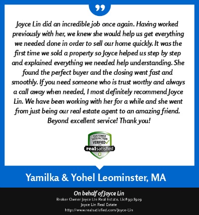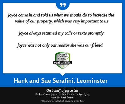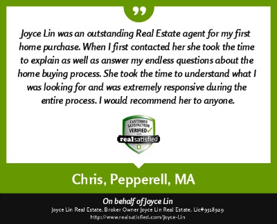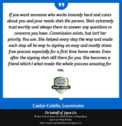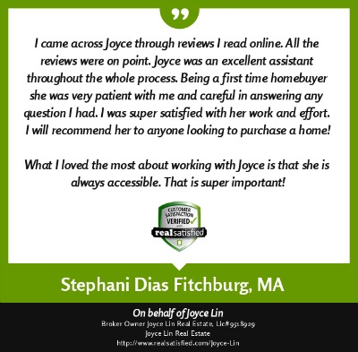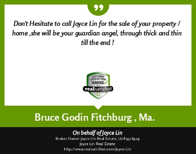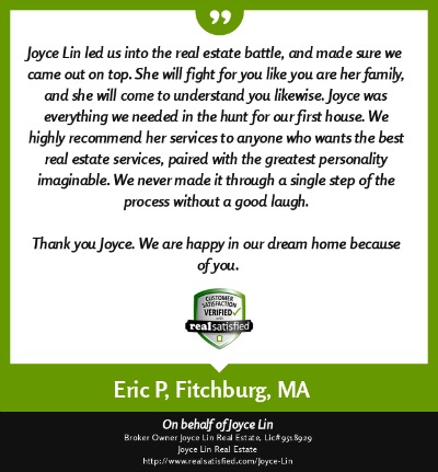 "My name is Duy Mai and I am a factory worker. I hired Joyce Lin as my Buyer Agent (her service cost me no money) and she help me buy a small house for my family at a fair price. Being a factory worker I had a very hard time dealing with all the paper work, yet she was there helping me out with everything, showing me where to get mortgage and what to look out for when buying a house. She even give me advice on how much a house actually worth. She is a very hard working Real Estate Broker and if it was not for her help I would still be looking for a house right now. She also help my brother buy a house in Fitchburg, MA. God bless her." ~ Duy M. ~ Nov 2012 |