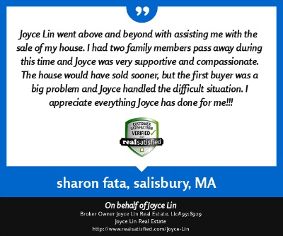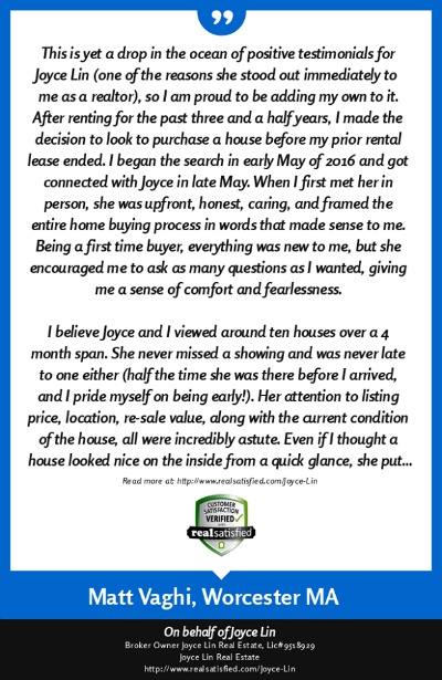 I wholeheartedly and without reservation recommend that you choose Joyce Lin as your REALTOR®. A first true home for me and my family would not be a reality without Joyce. We had limited funds with which to purchase, but still wouldn't settle for too much less than what we wanted. Our not wavering on this outlook led to over 8 grueling months of searching for the right house, in the right town. Joyce was never less than supportive and always cheerful. So much so, that it didn't take long for me to consider Joyce as not only our REALTOR®, but also a friend. Who could ask for more? Joyce will listen closely to your wants and do whatever is possible to help you attain them. With Joyce at the wheel, you will also give nary a second thought to scheduling, deadlines, or paperwork. Her