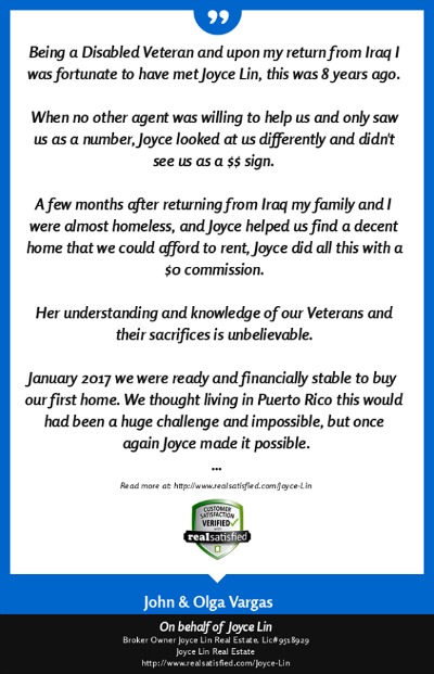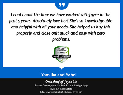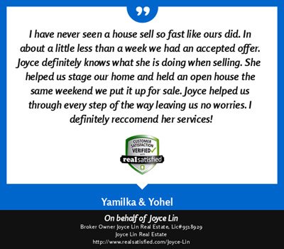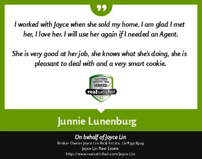 If you work with Joyce Lin, you will be working with someone that knows the meaning of customer service. She treated us like we were her only clients. She did whatever it took, and more, to help us find the right house and make sure we got to the closing table. I cant compliment her enough on the job she did. In Joyce we found a great Real Estate Agent and gained a friend as well. Great job, Joyce!" ~ Robert A. & Nayara A. ~ 2010 |