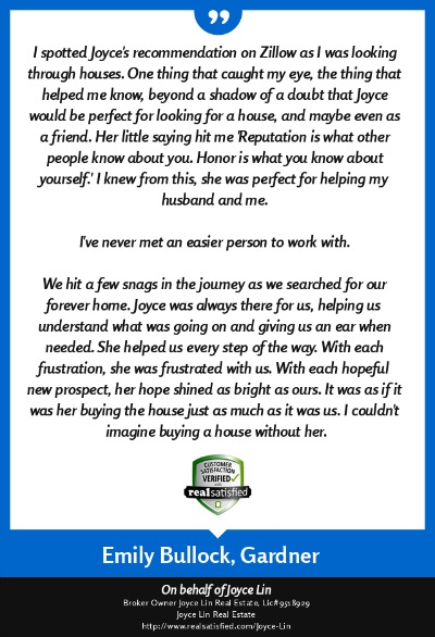 "I cannot say enough about Joyce! She helped my husband and I purchase our first home. She has this way of making you feel completely calm and at ease. We trusted her from the moment we met her and let her lead us. She invests herself 100% to the point where you always feel like her only client! You are her first and only concern and she makes that very clear from the get go...not just with words, with actions! She will give you her straight up honest opinion about everything and anything you ask her. We happened to buy the first house we looked at, I was holding back because I didn't want to be the "impulsive buyer", she understood my fear but at the same time helped me realize that this was the house for us. She could genuinely tell I loved the house but my nerves were getting the best of me and she helped me through it every step of the way! She becomes part of your family from the kids to the pets! It's actually 5 months TODAY that we closed and took the first steps in our first home. We couldn't be more happy with it! It's all thanks to Joyce and her expertise! There's no 5 stars here...I give her 10! Thank you Joyce Lin for everything that you have done for us!!" ~ M. & D. Legault ~ June 2014 |