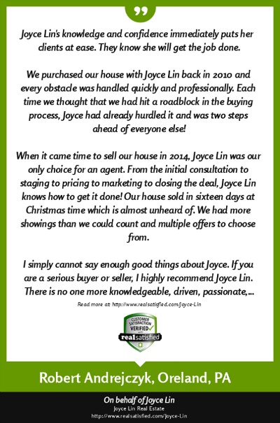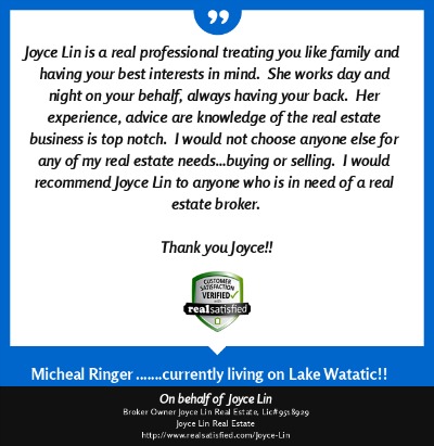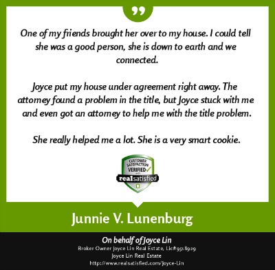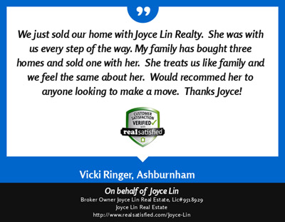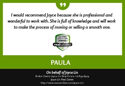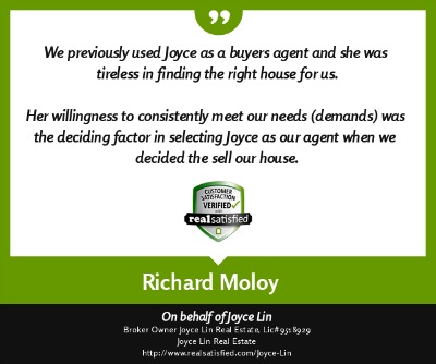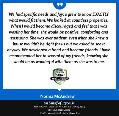 agent" like Joyce Lin. I can now sit back with satisfaction in my new home, thanks to Joyce Lin." ~ Judy Donovan ~ Aug. 2013 |