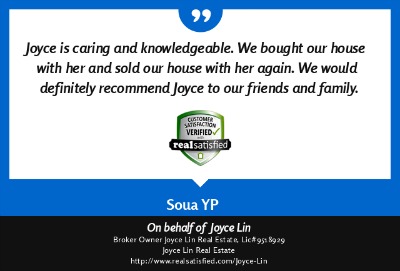 "If you are looking to buy a house talk with Joyce Lin. She was so knowledgeable during the whole process. She had never ending patience for our never questions. She took care of or checked out several possible issues before I even thought to ask about them. I have heard so many people that did not enjoy the process of buying their home, that was what I expected to happen. Joyce guided the process so smoothly that if I could, I'd buy more houses!" A million thanks to you Joyce!" ~ R. Brun ~ July 2014 |